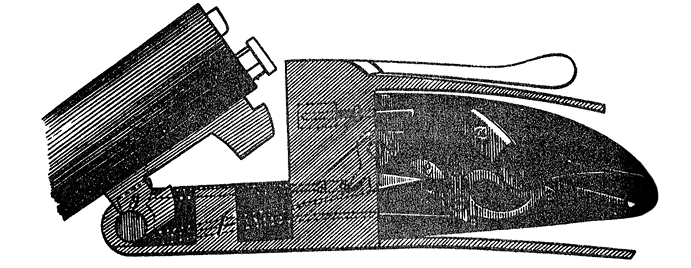 Ланкастер укрепляет свой ударник в колодке; заостренным верхним концом он бьет сквозь отверстие колодки в пистон, а внизу вращается на оси, спереди которой есть вырез для головки боевой пружины, а сзади – зубец для спускового крючка; пружина одноколейная идет под стволами вдоль колодки; у оси болта она имеет свою ось вращения, а конец ее выступает за пределы колодки и входит в цевье. Представим себе ружье после выстрела: ударник опущен на пистон; начинаем открывать стволы, они поднимаются, и особый выступ на них выходит из прорезанного для него вблизи оси-болта гнезда наружу, переставая давить на боевую пружину; в то же время цевье давит на короткий конец пружины и заставляет его опускаться, отчего пружина, поворачиваясь вокруг своей оси, начинает подниматься длинным своим концом и поднимает за собой ударник на взводе; все это время пружина, обращенная в простой стальной прут, действует как рычаг; теперь мы начинаем закрывать стволы: выступы на них, входя в гнездо, начинают давить при помощи особого колесика на пружину между точкой привеса ее (ее осью) и точкой соприкосновения ее с ударником; ударник же удерживается спуском, отчего пружина и не может отойти концом вниз; ясно, что она должна податься в середине, и из простого рычага она уже обращается в упругую пластинку. Стоит нажать спуск и освободить ударник, чтобы она с силой повернула его вокруг оси и заставила ударить по пистону.