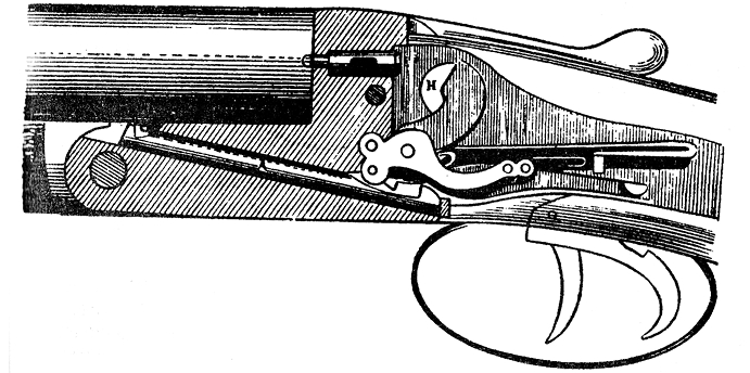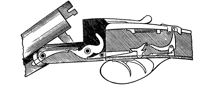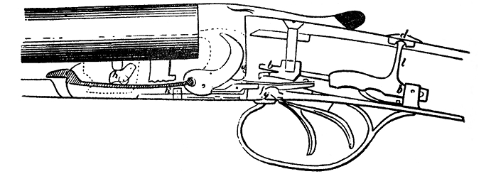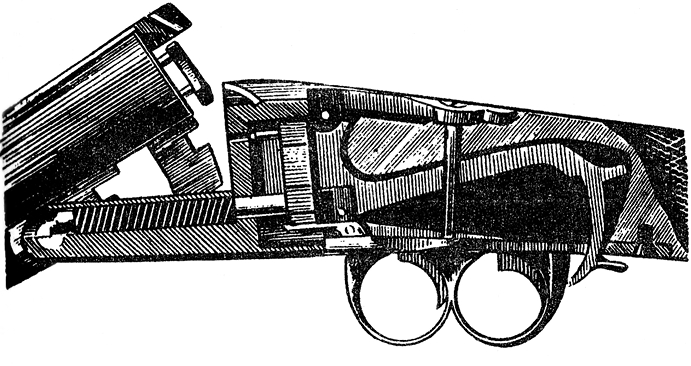 2) предоставляется стрелку возможность по желанию, не щелкая механизмом, опускать ударники, как курки курковых ружей, для чего стоит откинуть стволы, нажать на спуски и давить на них все время, пока стволы не станут в колодку;