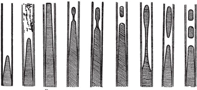 В совершенно прямом стволе длинные стороны треугольника во все время своего движения от казны к дулу не изменяют своей чуть-чуть дугообразной формы. Если же на пути треугольника встретится хотя незначительная кривизна, то стороны треугольника в этом месте изменяют свою форму; и чем сильнее (круче) погиб, тем вогнутые дуги на сторонах треугольника будут больше. Они могут сойтись до соприкосновения между собою и даже совсем исчезнуть, как бы перерезав треугольник на две части и оставя освещенным то место, где находится погиб. Большие и отлогие погибы изменяют стороны треугольника длинными и отлогими дугами. Большие и притом глубокие погибы опять‐таки перерывают треугольником на две части, и чем сильнее погиб, тем освещенное пространство между частями треугольника длиннее. Если на одной стороне ствола есть несколько сильных погибов, то и треугольник разрывается на несколько частей. Погибы в этом случае замечаются не все сразу, а последовательно один за другим во время подъема дула.