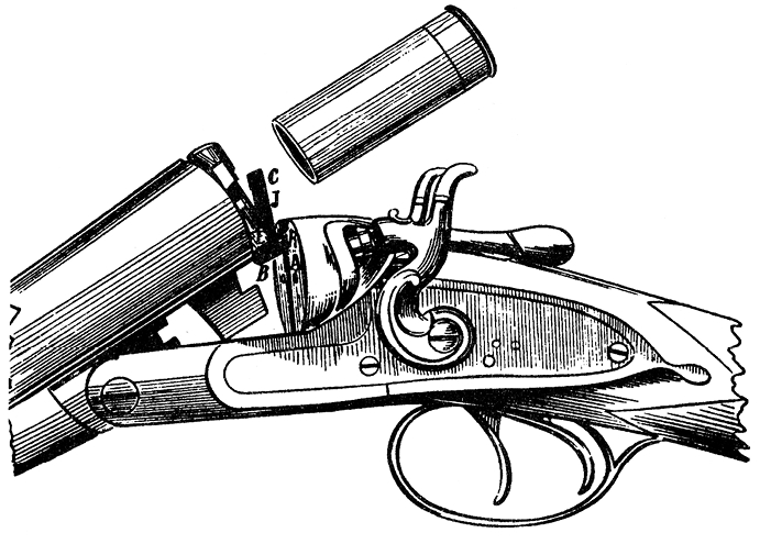 Последняя особенность в устройстве центральных ружей состоит в способе разбивания пистонов. Пистоны разбиваются здесь особыми шпильками или бойками, которые опираются снизу на ранты косых сквозных дыр в накладке, спиральными пружинами, а сверху на ранты – в сквозных же ступорках или бочонках своими валиками. Верхние концы шпилек, поднимаемые спиральными пружинами, выступают над бочонками на одну линию, а от удара носком (головкой) курка опускаются до верха бочонков, причем своим нижним концом разбивают патронный пистон. Иногда шпильки бывают без спиральных пружин и тогда выдвигаются над бочонками нажимом обреза казны стволов и днами патронных чашек.