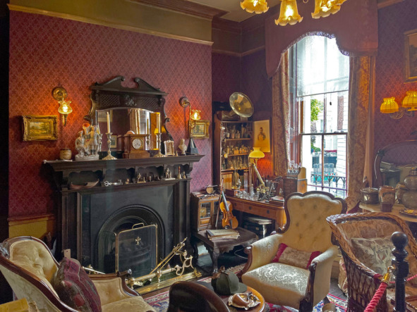 В гостиной, где Холмс принимал посетителей, курил трубку, играл на скрипке и проводил химические опыты, столько всяких вещей, что за пять минут, отведенных на эту комнату, не успеваешь увидеть и четвертую часть. Скрипка, стол с химической посудой, трубка, справочники, у камина два кресла, между ними столик с пепельницей, кепка сыщика и шляпа доктора Уотсона, лупа, на стенах картины, на каминной полке безделушки, на одной из полок граммофон – не помню, слушали ли Холмс с Уотсоном музыку? Много всего. Со мной ходили туристы из Японии, которые старались сделать фотографии всех членов группы на фоне вещей Холмса. В общем, комнату пришлось смотреть на фоне толкотни японцев и бубнения экскурсовода, который пытался рассказать о нравах и быте Викторианской Англии.