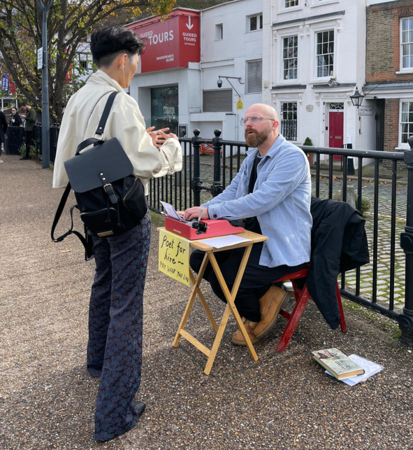 На свежем воздухе было бы совсем хорошо, если бы не толпа на набережной. Здание музея-электростанции хорошо сфотографировать можно только с моста, но против солнца. На набережной порадовал поэт. Он сидел на стуле перед маленьким столиком. На столике – пишущая машинка, очень похожая на знаменитую во времена СССР «Эрику», которая брала четыре копии – ага, так копировалась и распространялась нелегальная литература. Под крышкой столика висело объявление, что сидящий на стуле является поэтом по найму и он готов мгновенно сочинить все, что вы пожелаете. Понравится – заплатите. Я очень этим заинтересовался. Стоял и думал: стихи я не потяну, но рассказ на один абзац на любую тему – с этим справлюсь. И пишущая машинка меня не пугает, агрегат знакомый со студенческих времен. Я сделал фотографию поэта (пусть она послужит ему рекламой) на фотоне театра «Глобус», где уже несколько сотен лет играют пьесы Шекспира.