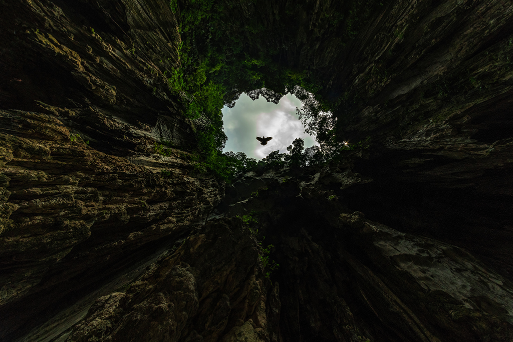 Imagine a cliff with a cave, look around paying attention to the details around you.