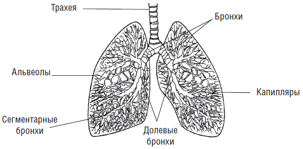 Дыхательные пути – это путь воздуха от ротового и носового отверстий до легочных пузырьков (альвеол). Воздухоносные пути расположены вне грудной полости и в грудной полости. К дыхательным путям, расположенным вне грудной полости, относятся рот, носоглотки и ротоглотка, гортань, трахея. Трахея делится на два ствола бронхов, ведущих к левому и правому легкому. Далее бронхи разветвляются справа на три, слева – на два долевых бронха, соответственно правое легкое состоит из трех, левое – из двух долей. От них отходят сегментарные бронхи, снабжающие более мелкие участки легких (сегменты). После последующего разветвления бронхиального дерева крайний бронх образует легочные пузырьки (альвеолы). Они состоят из тонкого клеточного слоя, под которым находятся мелкие кровеносные сосуды (капилляры), с помощью которых происходит газообмен. Кислород, вдыхаемый с воздухом, в альвеолах поглощается эритроцитами, углекислый газ попадает из крови в альвеолы. Примерно через два месяца после рождения ребенка альвеолы в функциональном отношении достаточно развиты. Новые альвеолы легких наиболее интенсивно образуются примерно до трех лет. После этого прекращается образование новых альвеол, увеличивается только их размер, пока грудная клетка не достигнет окончательного объема.
