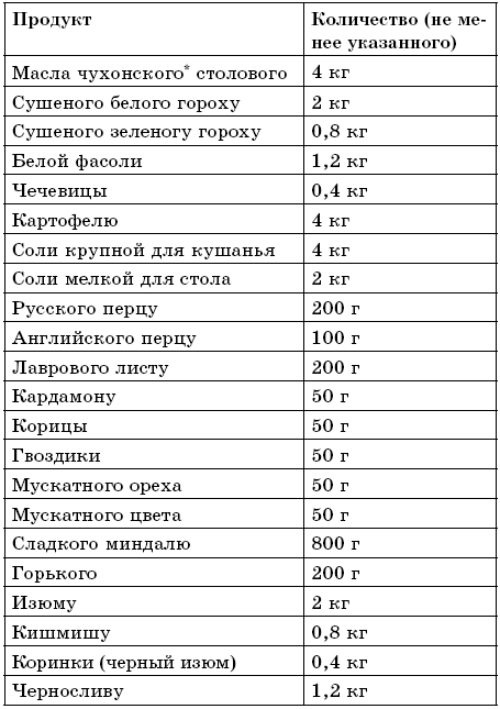 Для семьи в 4-6 человек (для семьи в 10 и 15 человек нужно запасать вдвое и втрое более) достаточно иметь в запасе: