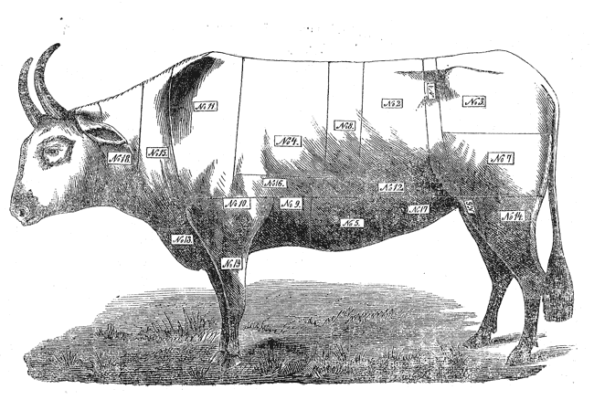 Вся огромная масса зарезанного и очищенного от внутренних нечистот быка называется тушею, которая разделяется, вообще, на 3 сорта говядины, а из этих трех сортов каждый состоит из нескольких кусков, различных между собою как по достоинству, так по форме и даже цвету. Эта туша и эти подразделения ее изображены очень подробно на наших рисунках, которые мы постараемся объяснить как можно проще, уверенные, что такие сведения вовсе не лишние для молодой и малоопытной хо зяйки; последняя может подвергнуться беспрестанным и очень убыточным обманам со стороны своей прислуги, если не будет в состоянии узнать по виду каждую купленную часть говядины.