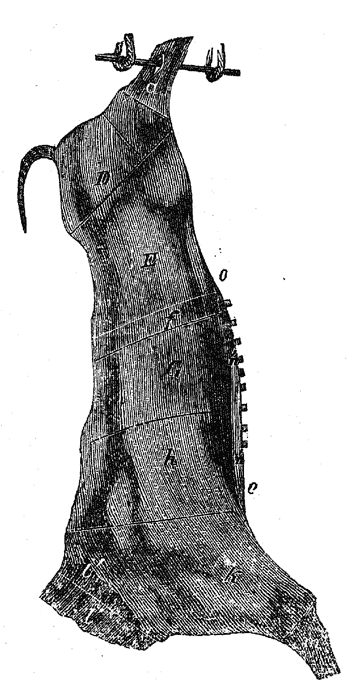 Фиг. 2-ая есть туша, уже очищенная и развешенная на железных крючьях, при помощи палки, которую мясник продевает сквозь голяшки задних ног.