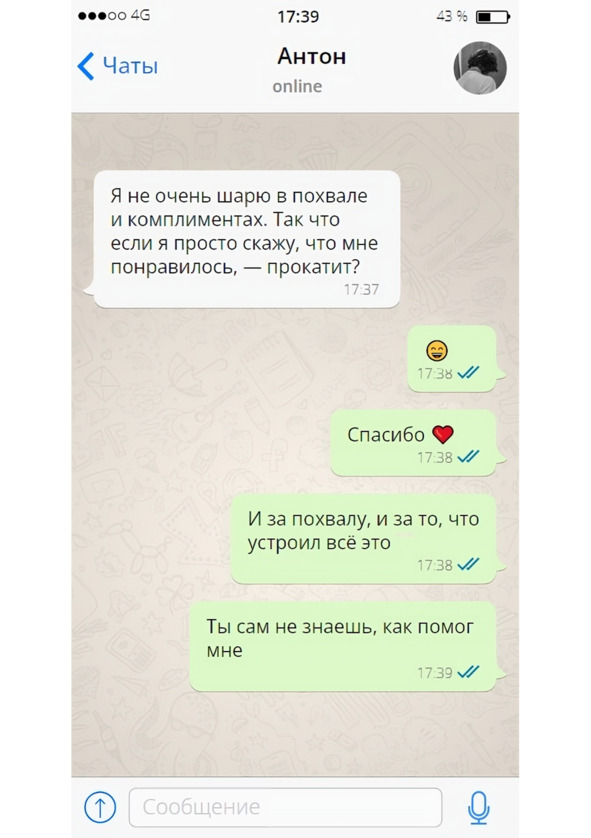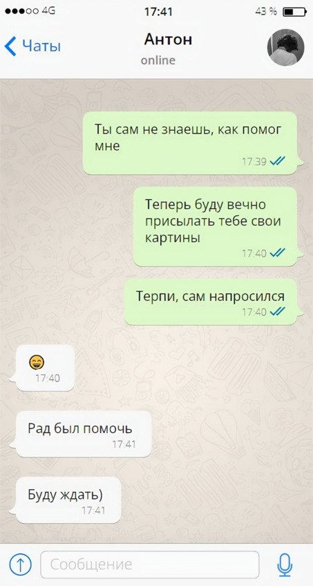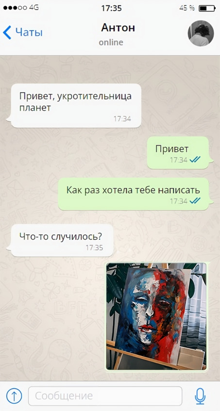 Я открыла диалог с Антоном. Мы ещё ни разу не переписывались. А зачем переписываться людям, которые почти друг друга не знают? Но почему один человек решил сделать бесценный подарок другому человеку, которого почти не знает? Это до сих пор не укладывалось у меня в голове. Я чувствовала себя обязанной. Пусть он и сказал, что я ничего ему не должна. Должна. Должна хотя бы показать, как он мне помог. Он был онлайн. Я колебалась между тем, стоит ли отправить ему фото моей картины или же подождать до субботы, чтобы он посмотрел вживую. В любом случае, мне очень хотелось, чтобы он её увидел. И только я решила всё же прикрепить фото, как от него пришло сообщение.