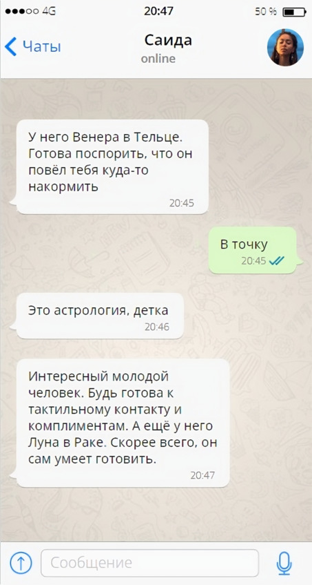 Глеб нажал кнопку на салфетнице, и через несколько секунд возле нас материализовался официант. Пока эти двое были заняты обсуждением заказа, я потянулась за телефоном, который провибрировал в сумке. Это Саида. Я попросила её пробежаться по нашей синастрии: вдруг его Солнце попадало в мой пятый дом?