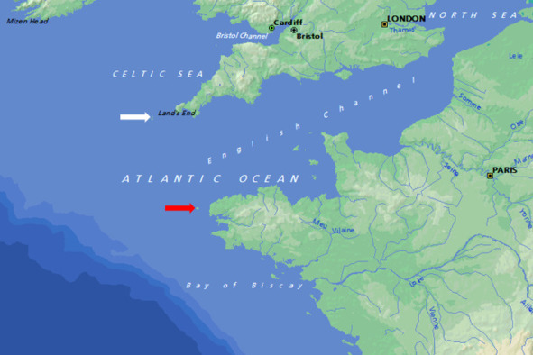 Архипелаг Силли (белая стрелка), остров Уэссан (красная стрелка)