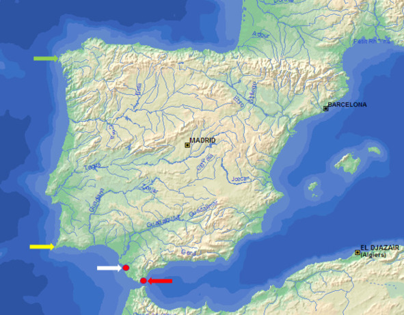 Гибралтар (красная стрелка), мыс Финистерре (зеленая стрелка), мыс Сент-Винсент (желтая стрелка), Кадис (белая стрелка)