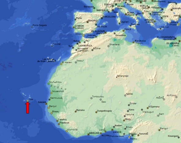 Чафаринские острова (желтая стрелка), Гибралтар (красная стрелка)