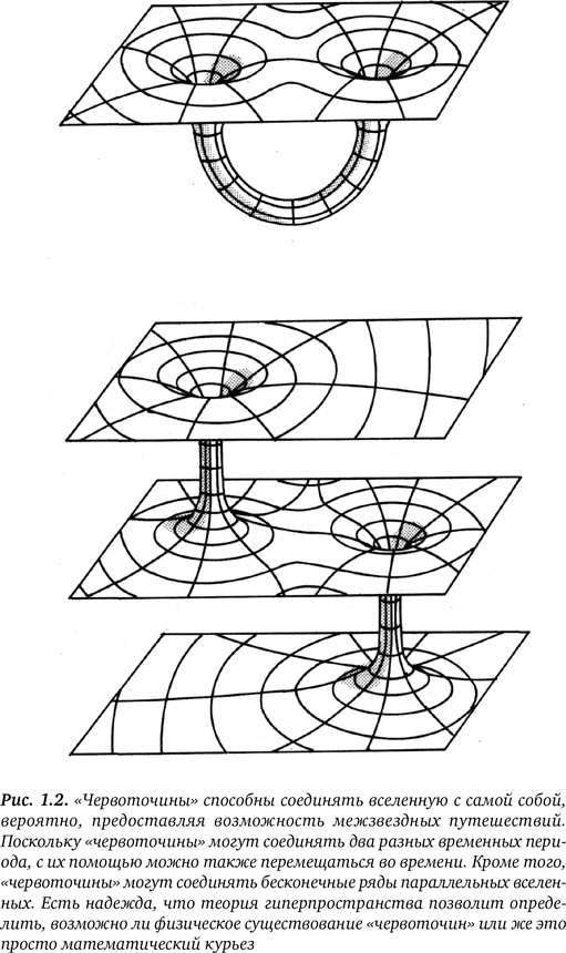 Проснувшись утром и открывая окно, чтобы впустить свежий воздух, мы рассчитываем увидеть двор своего дома. И никак не предполагаем обнаружить возвышающиеся перед нами египетские пирамиды. Подобно этому, когда мы открываем дверь, мы готовы увидеть автомобили на улице, а не кратеры и потухшие вулканы на безжизненном лунном ландшафте. Даже не задумываясь, мы подразумеваем, что можно открывать окна или двери и не опасаться, что увиденное перепугает нас до смерти. К счастью, наш мир – не фильм Стивена Спилберга. Мы действуем в соответствии с глубоко укорененным (и неизменно верным) предубеждением, что наш мир односвязный, что наши окна и двери – не входы в «червоточины», соединяющие наш дом с далекими вселенными. (В обычном пространстве веревочную петлю всегда можно затянуть в точку. Если это возможно, такое пространство называется односвязным. Но если петля помещена вокруг устья «червоточины», ее нельзя стянуть в точку. При этом веревка попадет в «червоточину». Такие пространства, где веревочные петли невозможно стянуть, называются многосвязными. Хотя изгиб нашей Вселенной в месте ее перехода в невидимое измерение экспериментально подтвержден, вопросы о существовании «червоточин» и многосвязности нашей Вселенной, по-прежнему остаются предметами научных споров.)