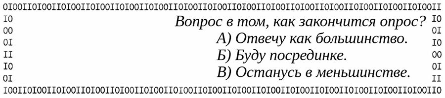 Результаты опроса[1] оказались следующими: вариант А выбрал каждый четвёртый, вариант Б – каждый третий, но больше всего участников предпочли вариант В. Хотя очевидно, что если каждый проголосует за А, то все ответят верно, тем не менее респонденты предпочли остаться в меньшинстве.