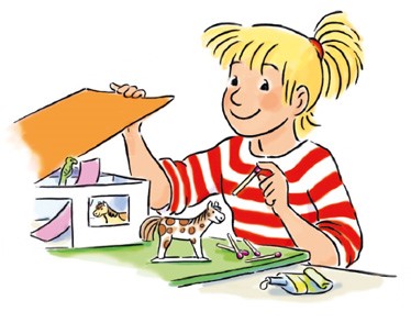 Конни повторяет попытку: она макает спичку в клей и плотно прижимает её к картону. Но только она собирается осторожно отпустить спичку, как та опять прилипает к пальцам. Сколько можно!