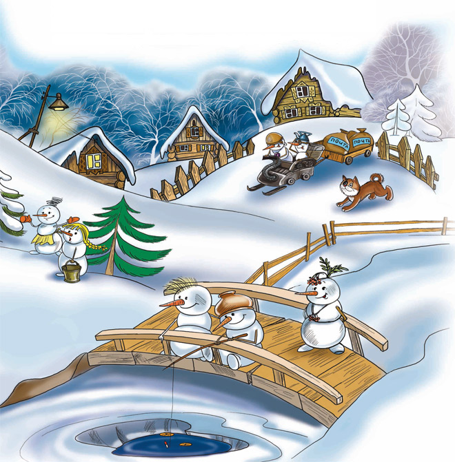 Далеко на севере есть невидимая деревня Дедморозовка. В этой деревне живут дед Мороз со Снегурочкой и их помощники – снеговики и снегови́чки.