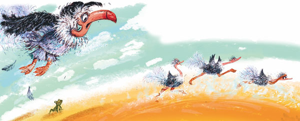 Обиделся Лев и бросился за ним в погоню. Страус даже извиниться не успел. И теперь давай только уноси ноги!..