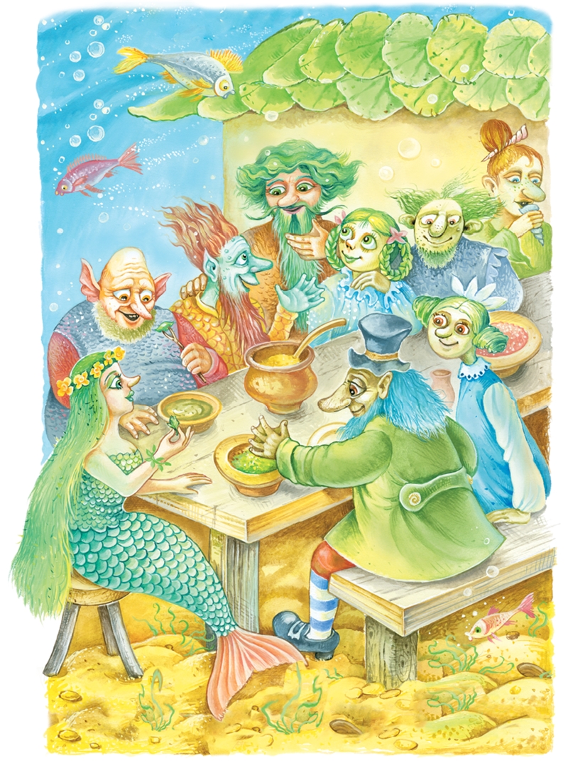 Мать Маленького Водяного принесла гостям сперва суп из зелёной ряски, потом жареную рыбью икру с сушёными водорослями. Потом она поставила на стол салат, искусно приготовленный ею из колодезных жучков с мелко нарезанными стеблями калужницы. Кому всего этого было мало, мог ещё отведать тушёных лягушачьих язычков и целую миску солёных стрекозиных личинок… Да, да, всё не как у бедных людей!