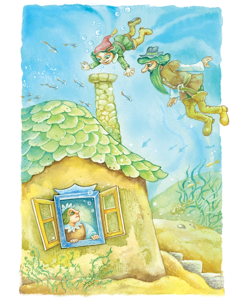 Отец-водяной снял свои жёлтые сапоги и вошёл в дом на цыпочках. Дом этот был выстроен из камыша и стоял глубоко на дне мельничного пруда. Вместо цемента он оштукатурен илом – это ведь дом водяного! А в общем, он был самый обыкновенный, как и все остальные дома, разве что намного меньше. Потому что водяные намного меньше людей. В доме были кухня, кладовка, гостиная, спальня, а также сени и коридор. Полы присыпаны чистым белым песком, окна занавешены зелёными занавесками, сплетёнными из водорослей и лилий. И, конечно же, все комнаты, и кухня, и сени, и коридор полны воды. Да и могло ли быть по-другому, если дом стоял на самом дне мельничного пруда?