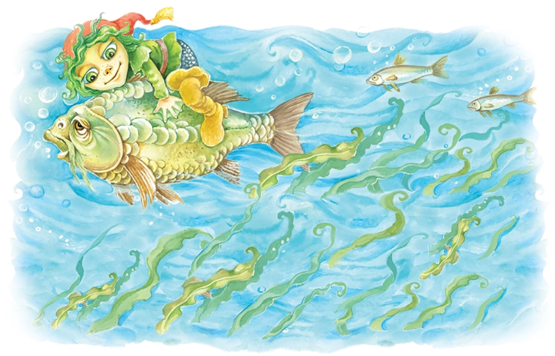 Тут Маленький Водяной залез на Купринуса, а отец показал ему, как следует держаться. И Маленький Водяной, удобно устроившись на спине Карпа Купринуса, верхом поехал домой.