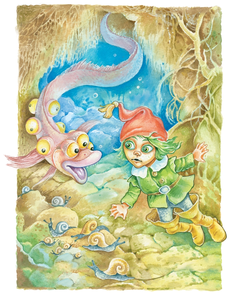 Пещера была тёмной и мрачной. В первый момент малыш подумал, что многоглазый зверь – это огромный бледный червяк. Но потом он увидел на спине и боках страшного зверя плавники и понял, что это рыба. Длинная рыба, по бокам которой тянулись с двух сторон круглые глаза – один за другим!