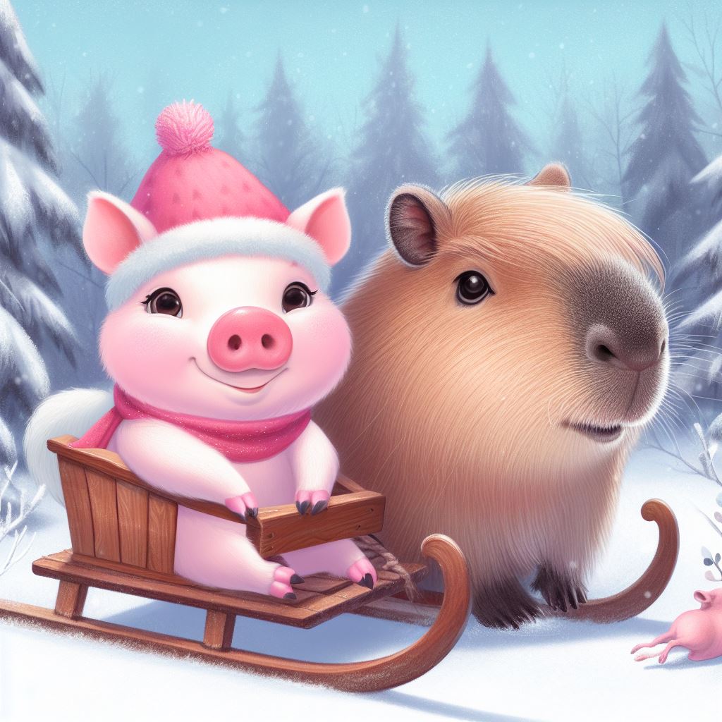 И они вышли из домика и сели на саночки. Капибара Соня была очень сильная и ловкая. Она толкала саночки своими лапами и разгоняла их до большой скорости. Поросёнок Женя держался за неё и кричал от восторга.
