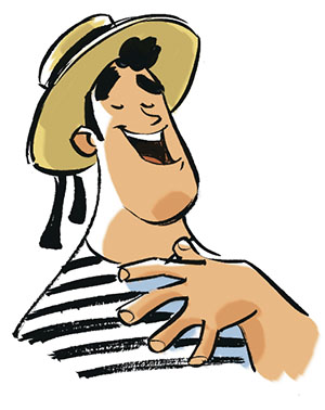 Гондольер. Катает туристов по каналам Венеции, распевая романтические баллады.