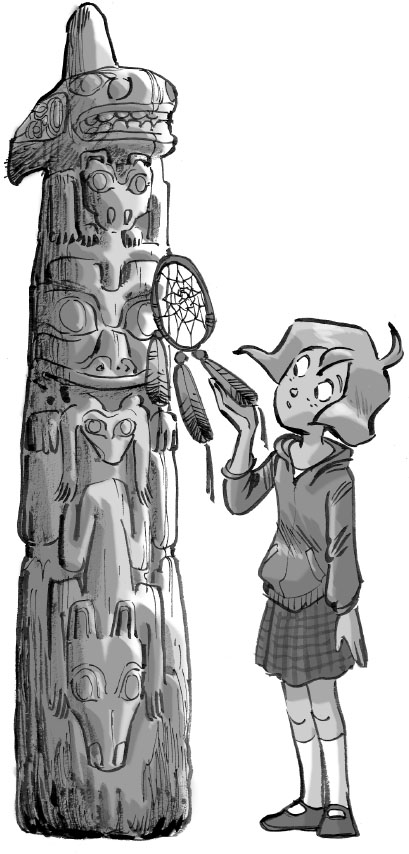 Внимание Агаты привлёк любопытный предмет, подвешенный на руку тотема. Это было кольцо, оплетённое перьями и кожаными лентами. Девочка вспомнила, как читала в одной книге, что такой амулет называется «ловец снов»: американские индейцы верили, будто он притягивает хорошие сновидения и отпугивает плохие. Достав ручку и записную книжку, Агата принялась строчить.