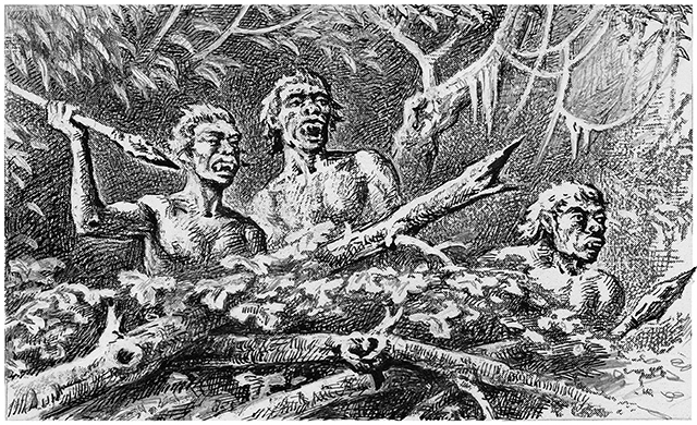 Обогнув кустарник, Нао пригнулся и двинулся к тому месту зарослей, где при вспышке пламени он увидел людей. Огонь помогал ему ориентироваться: слабый красноватый отблеск обрисовывал кусты и указывал верное направление; сам же Нао был невидим для врагов. Он продвигался медленно, зигзагами и часто останавливался, сжимая в руках палицу и топор; иногда он ложился, прикладывал ухо к влажной земле и слушал. Глинистая почва размякла от непрерывных дождей, и благодаря этому он крался совершенно бесшумно; даже самое чуткое ухо не смогло бы уловить звук его шагов. Не доходя до кустов, Нао остановился и долго стоял неподвижно. Время шло, но вокруг по-прежнему был слышен только дробный стук дождевых капель да шорох колеблемых ветром трав.