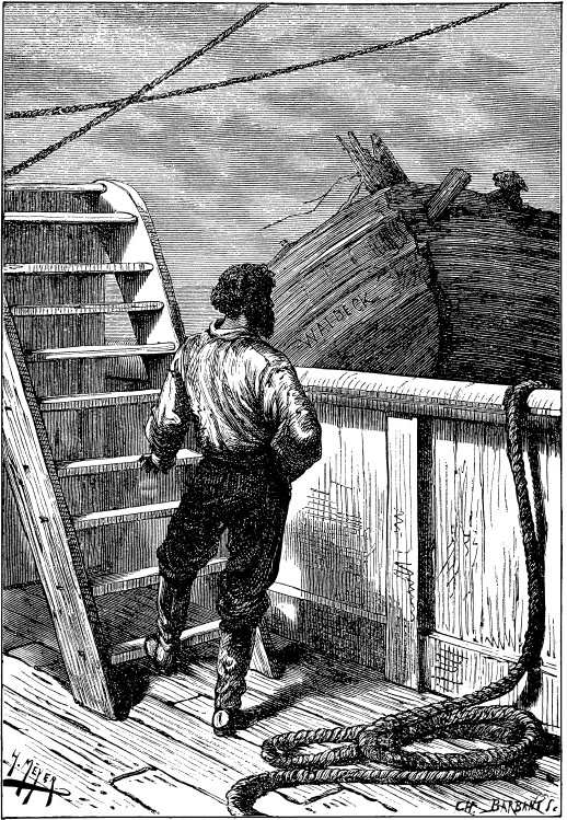 «Пилигрим» лег в дрейф, то есть паруса его расположили таким образом, чтобы ветер не мог наполнять их, вследствие чего движение судна прекратилось и оно медленно покачивалось на волнах. Через пять минут маленькая капитанская гичка уже направлялась к несчастному враку, быстро скользя по волнам благодаря могучим размахам четырех весел в руках опытных старых матросов. Дик Сэнд занял место на руле и направил лодку к корме погибшего судна, где, по-видимому, можно было легче всего подняться на палубу.