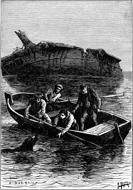 Но едва собака заметила, что шлюпка начала удаляться, как она бросила пить и жалобно завыла, повернув голову к обломкам. Ее голос и взгляд были так красноречивы, что не понять их не было возможности. Очевидно, на враке оставался еще кто-нибудь – быть может, хозяин спасенного животного. Но отчего же он не подавал признаков жизни? Отчего не откликался на призывные крики матросов?