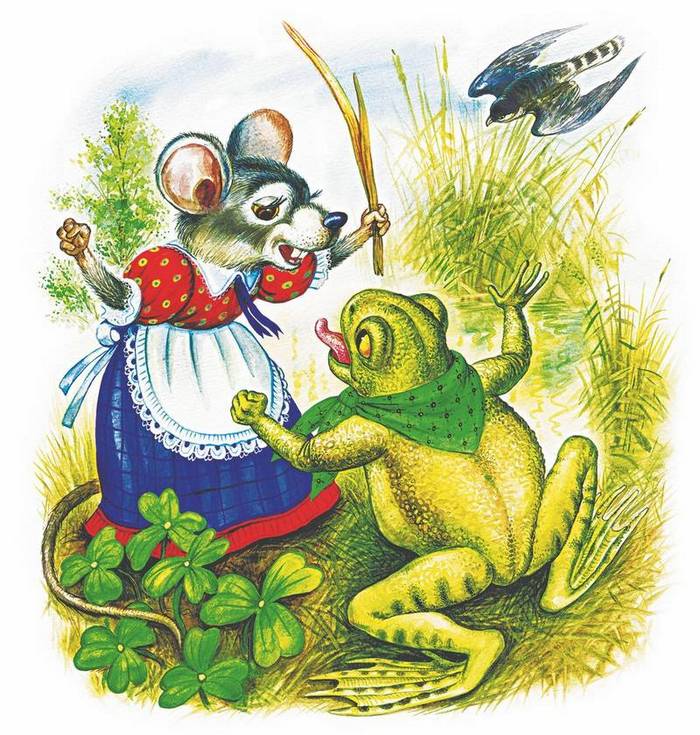 Лягушка и мышь завели ссору. Вышли на кочку и стали драться. Ястреб видит, что они о нём забыли, спустился и схватил обеих.