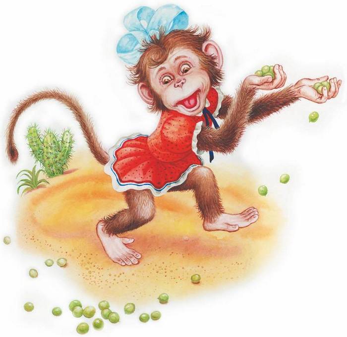 Обезьяна несла две полные горсти гороху. Выскочила одна горошинка; обезьяна хотела поднять и просыпала двадцать горошинок. Она бросилась поднимать и просыпала все. Тогда она рассердилась, разметала весь горох и убежала.