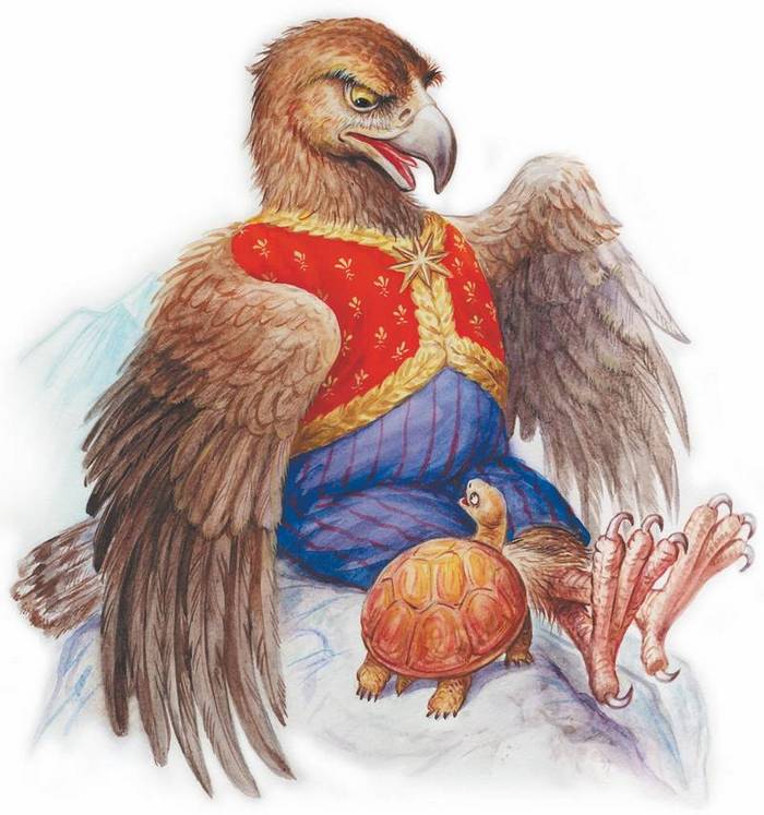 Черепаха просила орла, чтобы научил её летать. Орёл не советовал, потому что ей не пристало; а она всё просила. Орёл взял её в когти, поднял вверх и пустил; она упала на камни и разбилась.