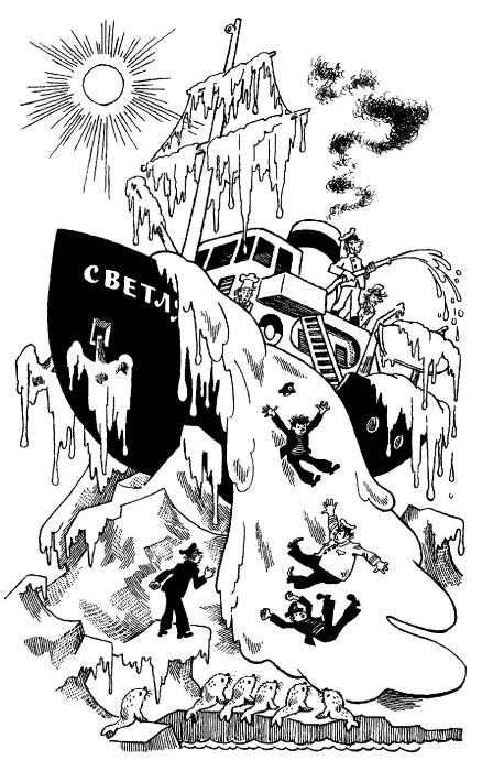 Команда бросилась в коридор, вышибла дверь и, вылетев на палубу, с криком пронеслась под уклон по сверкающему льду и вывалилась на поле. Моряки от удивления вытянули шеи: вместо вчерашнего уютного «Светлячка» перед ними задирало нос обросшее льдами судно. На вантах качался лёд, с мачт свисали сосульки, и влажный ледяной бугор, как осьминог, расползался с рубки по всей палубе.