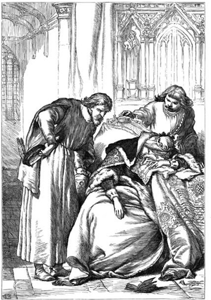 Сын уверяет королеву, что от ее переживаний больному легче не станет, и лучше постараться развлечь его чем-нибудь веселым, чем расстраивать короля и этим усугублять его нездоровье.