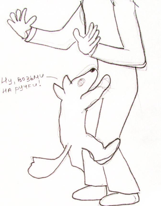Первый раз мой щенок не хотел даже из квартиры выходить: сидел, упирался, вцепившись когтями в пол. Я взяла его на руки и, выйдя на улицу, спустила на траву. По моей ноге он попытался забраться на меня вновь. После того, как попытки забраться на меня и возвращение на землю повторились несколько раз, он все же свыкся с мыслью, что на себе я его таскать не собираюсь. Хотя «залезть на ручки» и по сей день – любимое занятие моего 47-килограммового пса.