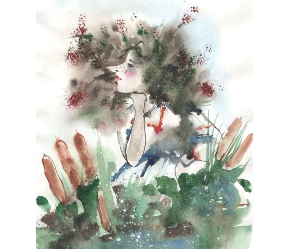 В волосы травы, да цветы вплетены. Из-под длинного платья с кувшинками виднеются босые пятки. Стоит, по сторонам зыркает, а в каждой руке по курице. Видимо опять ночью в селе была.