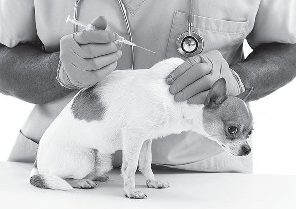 Подкожные инъекции (вакцины, сыворотки и препараты пролонгированного действия) делают обычно в область лопаток, холки, внутренней поверхности бедра. Для этого иглу вводят под углом 45° к поверхности тела, слегка оттянув кожу. Если вы соберете кожу в складку, то рискуете проколоть ее насквозь или попасть себе в палец. При введении раствора образуется маленькая шишечка, которая затем рассасывается.