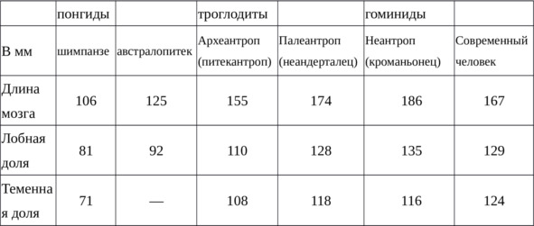 Как можно видеть из таблицы 1, взятой из монографии Поршнева Б. Ф. 1972 «О начале человеческой истории» (по Кочетковой В. И.)