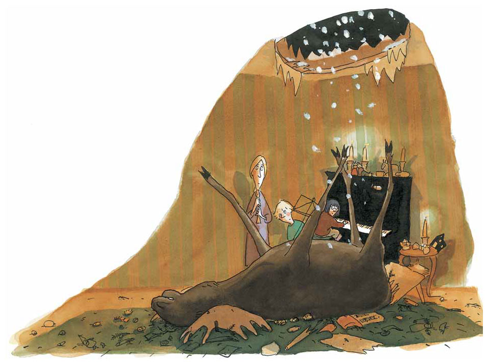 Но с небес явились не ангелы, а мистер Мюз. Раздался оглушительный грохот, и в следующую секунду он рухнул в гостиную, проломив потолок. Точнее говоря, сперва он проломил крышу, а потом и потолок.