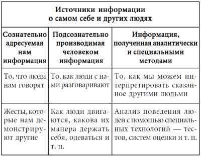 Всю информацию о других людях (а потому и о нас самих) можно разделить на три группы. Первая часть информации, которую мы воспринимаем (или можем воспринять, если постараемся сделать это), является «сознательно адресованной нам информацией» (сюда относится то, что нам говорят, то, какие жесты нам демонстрируют и т. п.). Вторая часть информации также адресуется нам, но человек, будучи ее автором, производит данную информацию подсознательно, сам того не замечая (это, прежде всего, его манера держаться, интонации голоса, одежда). Третья часть доступной нам информации получается чисто аналитически при сопоставлении того, что вам «посылают» осознанно, того, что наш визави «производит» подсознательно, и, наконец, наших знаний о человеческой природе, о психических законах.