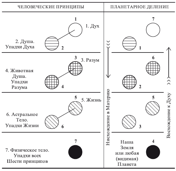 Темные горизонтальные линии низших планов означают Упадхи, если они рассматриваются как человеческие Принципы, и планы в случае Планетной Цепи. Конечно, что касается человеческих Принципов, то диаграмма не помещает их в вполне точном порядке, но все же показывает соответствие и аналогию, к которым призывается сейчас внимание читателя. Как читатель увидит, это есть нисхождение в материю, приноравливание – как в мистическом, так и в физическом смысле – обеих сущностей и их переплетение в ожидающей их великой, грядущей «борьбе за существование». Может быть, термин «Сущность», употребленный для Небесного тела, является странным, но древние философы, представлявшие себе Землю как огромное «Животное», были в свое время мудрее, нежели современные геологи; и Плиний, называвший Землю нашей доброй кормилицей и матерью, единым Элементом, не враждебным человеку, был ближе к истине, нежели Уаттс, воображавший, что он видит в ней подножие Бога. Ибо Земля есть лишь подножие человека в его восхождении к высшим областям; Преддверие —