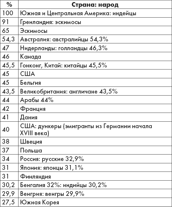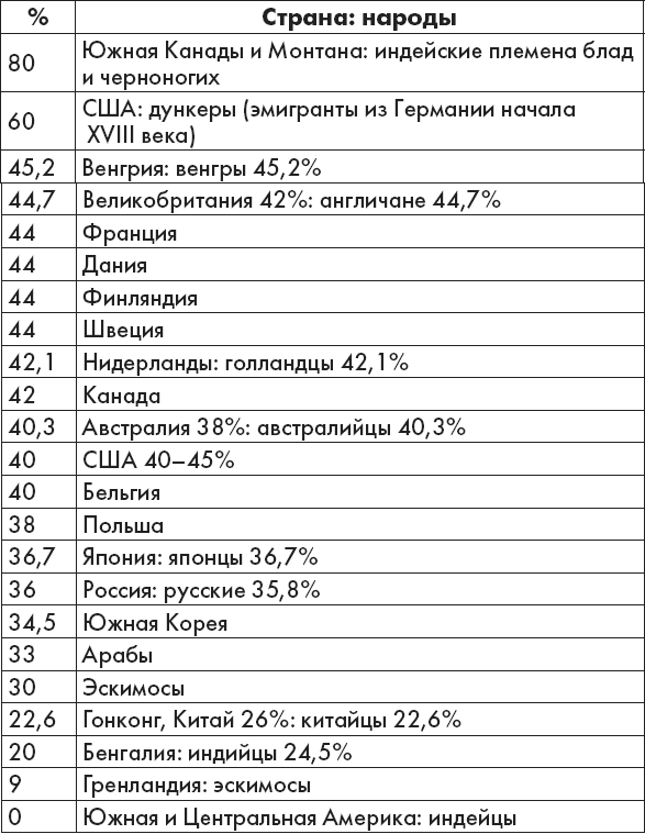 Первая группа крови (среднее количество в популяции, в процентах)