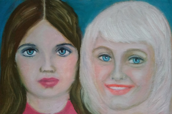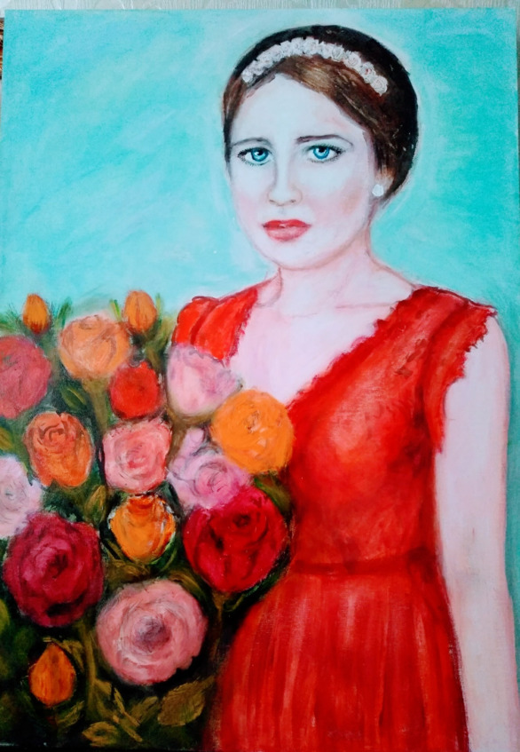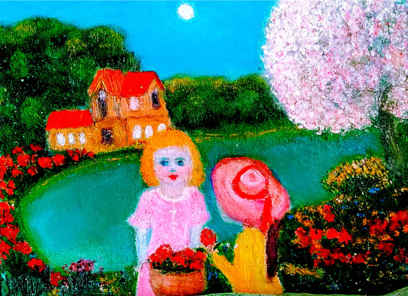 Картина автора маслом: дочери Таня и Наташа с корзиной роз