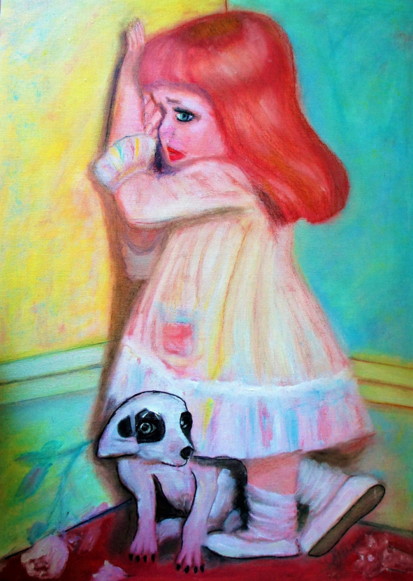 Картина автора маслом: Танечка с разбитой вазой и собачкой Чарли