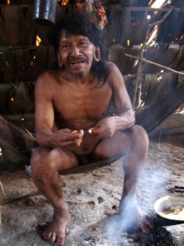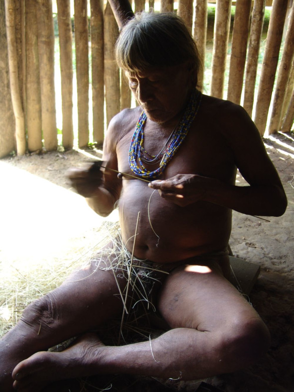 Миниуа, улыбчивый мужчина лет пятидесяти, как и Кемпери с Ауа, ходит обнаженным, лишь подвязав половой член хлопковым шнуром к поясу. Я нахожусь у него в гостях в его традиционной хижине, помимо людей вмещающей еще и небольшой зоопарк, состоящий из пестрых попугаев трех видов, двух черных красивых птиц паухиль (Mitu tomentosum), кур, маленькой игрунковой обезьянки, птиц Psophia crepitans, также в большом количестве разгуливающих по всей деревне, и пытаюсь расспросить Миниуа о верованиях ваорани. Он сидит у костра в своем гамаке и скручивает длинную прочную нить из волокон пальмы чамбира, из которой позже его жена сплетет новый гамак. На мой вопрос Миниуа отвечает, что он ничего не знает о духах, населяющих лес, потому что он не шаман. Шаман – Кемпери, он все знает о духах, населяющих лес, и может даже сам перевоплощаться в ягуара.
