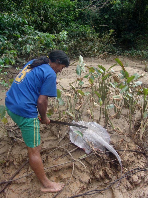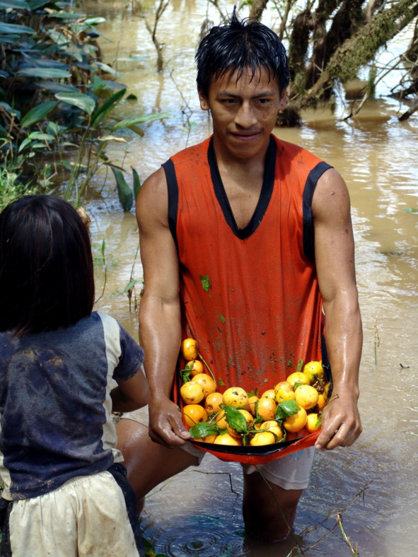 Однажды Ауа увидел, как мы собираемся на рыбалку, мастерим снасть, привязываем леску к крючкам, и тут же просит дать и ему крючков. Я охотно предлагаю на выбор несколько из них, а также и свинцовые грузила. Он, явно имитируя знание, выбирает себе крючки самых больших размеров, довольный приобретением, отходит в сторону. Но через некоторое время возвращается в полном недоумении, как ему для ловли рыбы соединить воедино все эти хитрые принадлежности. И действительно, зачем ваорани такие непонятные предметы, если они никогда не занимались рыболовством на больших реках, а у самого Ауа и вовсе присутствует ярко выраженный этнически закрепленный страх перед водой. Мелкую же рыбешку из лесных неглубоких ручьев, если очень захочется, всегда можно поймать, используя яд барбаско – растения, которое специально выращивается рядом с домом.