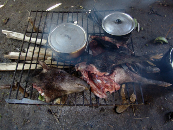 Как выяснилось, с охоты они принесли двух пекари, так что в этот день маленький праздник состоялся почти у всей деревни. Охотники разделили добычу между несколькими семьями. По струйкам дыма, подымавшимся над пальмовыми крышами, легко определялось, в каких хижинах сегодня готовилось традиционно – либо коптилось, либо варилось – сытное мясо пекари, по вкусу напоминающее нечто среднее между дикой свиньей и телятиной. Было приятно наблюдать счастливые и радостные лица наевшихся от души веселых и довольных индейцев. Один из охотников говорит, что добытого мяса хватит всем на два дня.