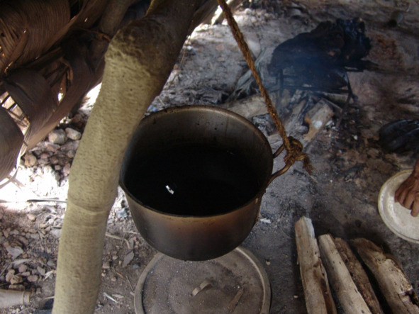 Приготовленный Кемпери оме находится в алюминиевом котелке, прикрытом крышкой и висящим на довольно неустойчивой конструкции – деревянной палке, диагонально воткнутой в землю. Сняв крышку, я пытаюсь сфотографировать легендарный яд, при этом неловко задеваю шаткую конструкцию, которая моментально вздрагивает. Вместе с ней вздрагивает и Кемпери. Разлить готовый оме – большое несчастье для ваорани, это их ценность, средство, способное обеспечить едой. Яда много, и сегодня все мужчины деревни точат новые стрелы для своих духовых трубок. Как оказалось, все они специально не делали оме сами, а ждали, когда его на всех приготовит Кемпери, и они возьмут у него немного яда и для своих стрел. Обожженный над огнем на кончиках стрел, оме сохранит свое смертоносное действие еще в течение двух—трех месяцев.